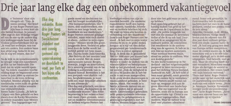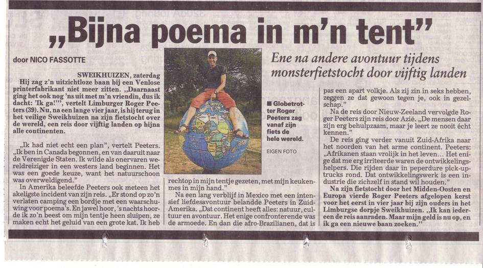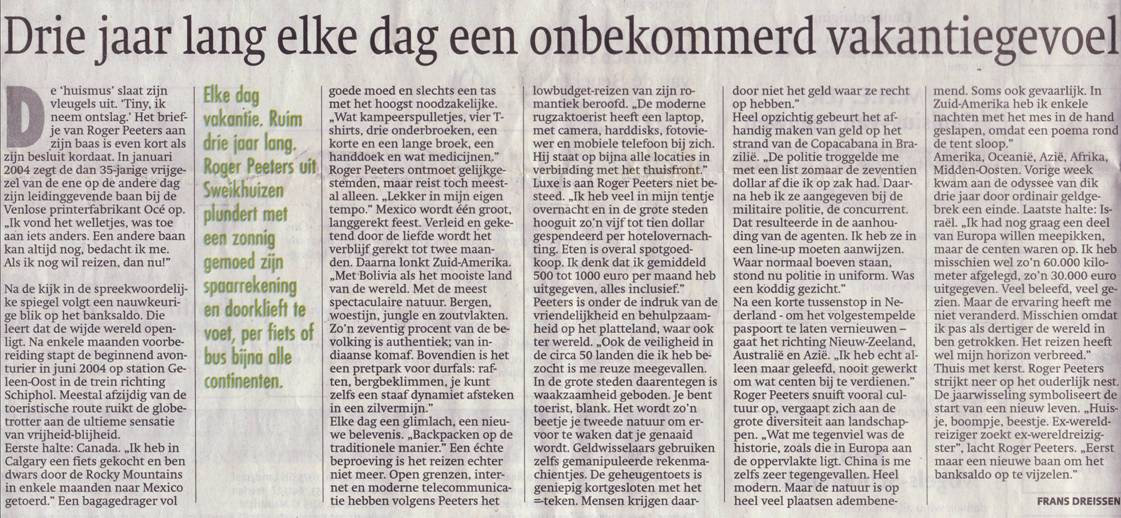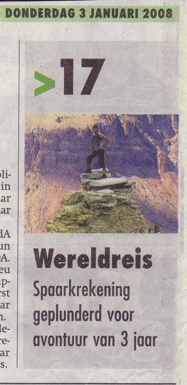 Newspaper article . The local newspaper dedicated a whole page to my trip (de Limburger, editie sittard-Geleen, Jan 3th 2008, page 13).