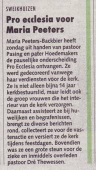 She was decorated by priests with the 'pro ecclesia et pontifice' medal from the pope for all the work she has done for the church of Sweikhuizen.